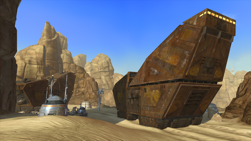 Глубоко во Внешнем Кольце пески Татуина пекутся под светом двух ярких солнц. Небольшие группы цивилизованных общин занимают лишь крупицу пустынного ландшафта, окруженные бесконечными просторами бесплодных дюн и каменистых каньонов, бесшумно погубивших множество смельчаков, которые отважились пойти в пустыню. Среди крохотных городков и поселений, с невиданным упорством продолжающих свое существование, путешественники могут найти приют от сурового климата, однако доверие – это такая же редкость, как и вода, в этом преступном мире. Как гости, так и местные жители должны постоянно быть бдительными в городках Татуина.
