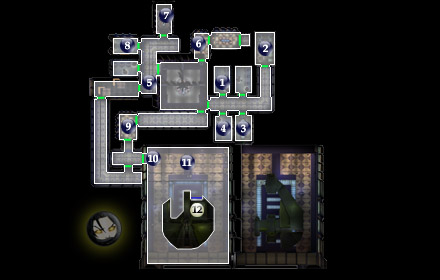 Это место, где вы оказываетесь после экскурсии с Давиком. Как он и сказал, вы можете свободно ходить по комнатам и помещениям для рабов (#2), но выйдя за эти пределы, вы серьезно (как думает Давик) рискуете. Ваша цель — украсть корабль Давика «Черный Ястреб» и улететь с этой планеты. Чтобы попасть на корабль, вам будут нужны коды доступа. Комната для гостей (#7) — попробуйте поискать там.